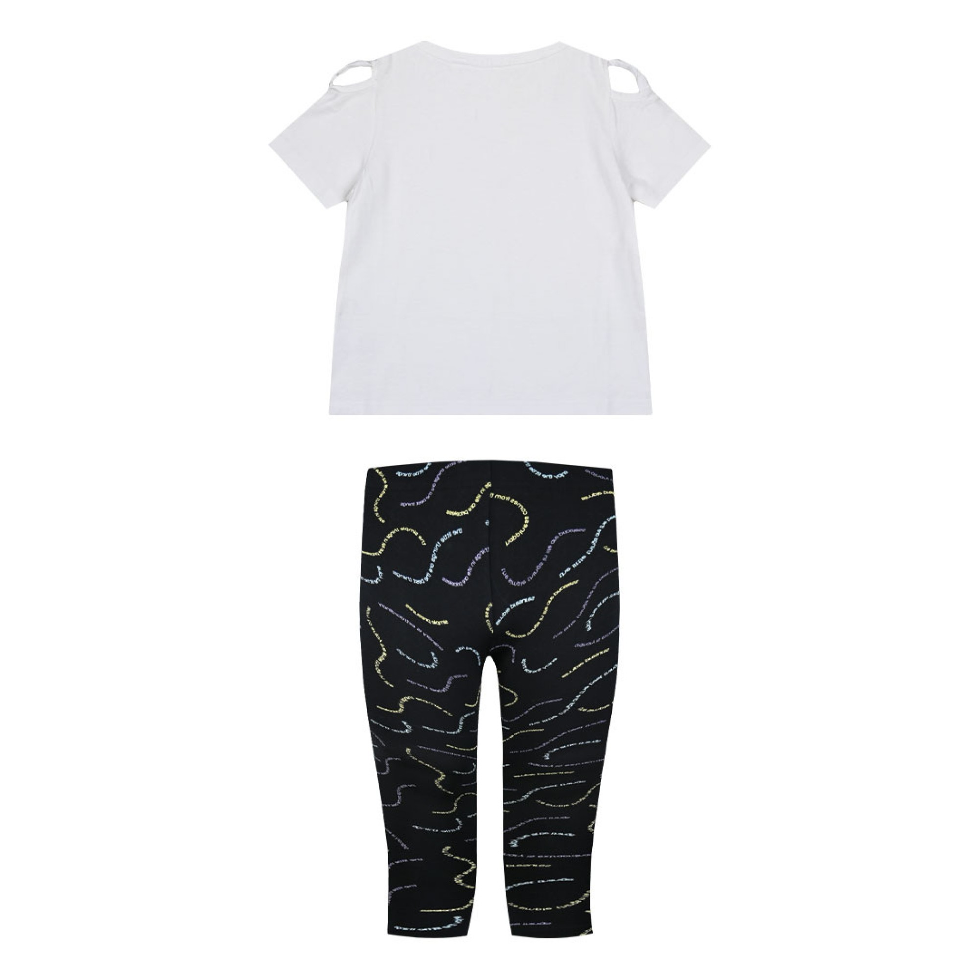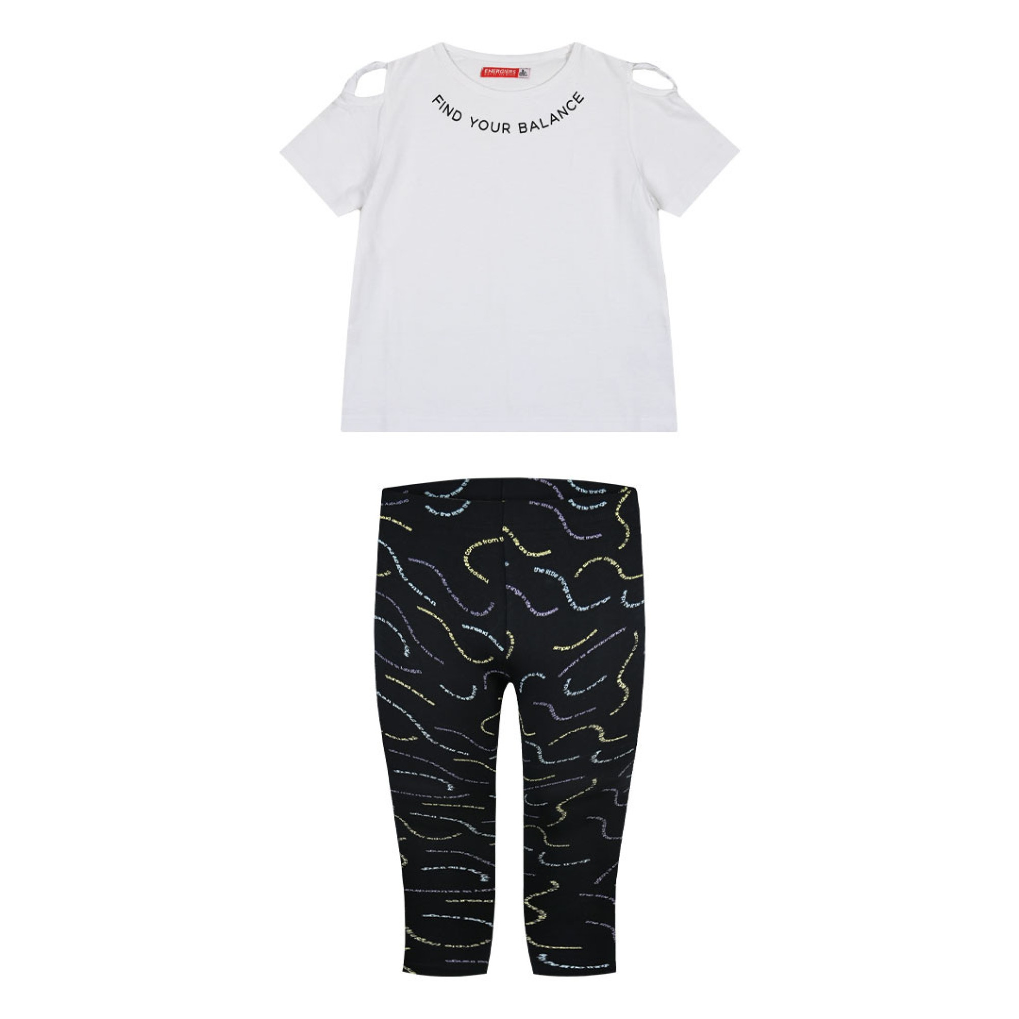 Παιδικό σετ 2 τμχ για κορίτσι. Μπλούζα κοντομάνικη λευκή με όμορφα ανοίγματα στους ώμους και τύπωμα “Find your balance” συνδυασμένο με εμπριμέ κάπρι κολάν. Ένα υπέροχο σετ για μια άνετη και μοντέρνα εμφάνιση.