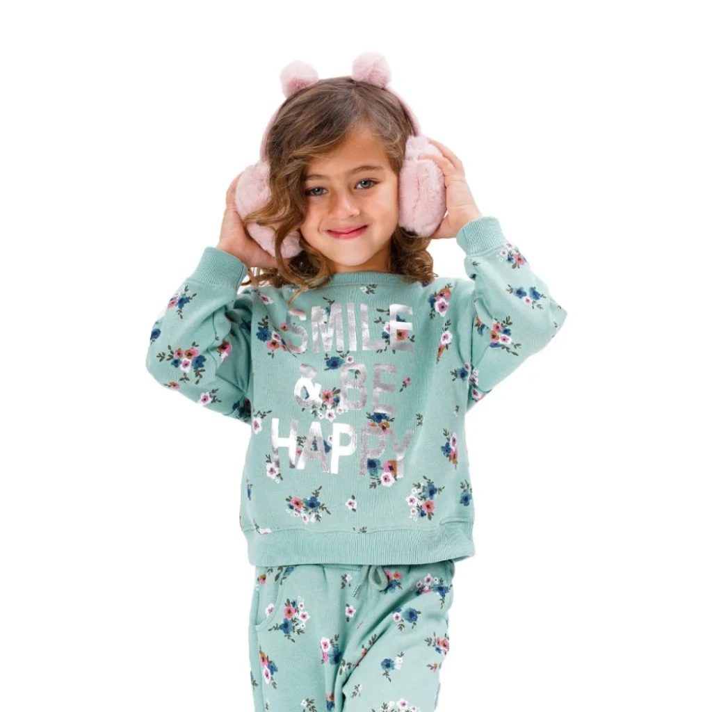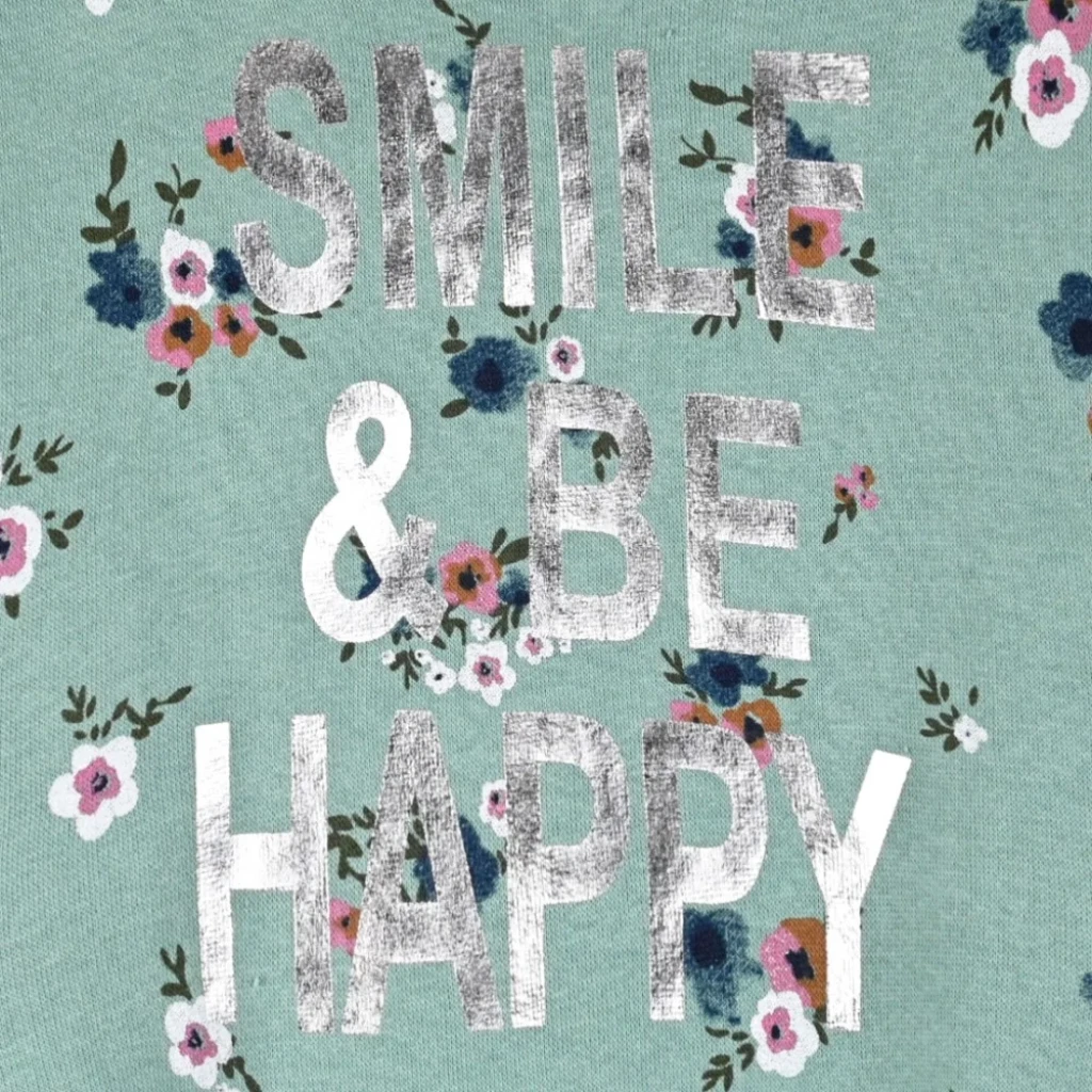 Μπλούζα μακρυμάνικη πράσινο του πάγου με λάστιχο στη μέση και φλοράλ ασημί σχέδιο smile & be happy.