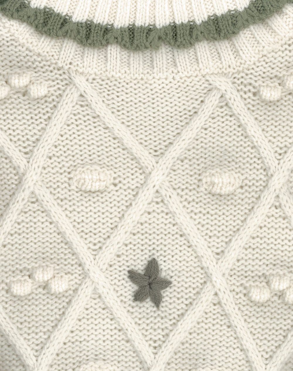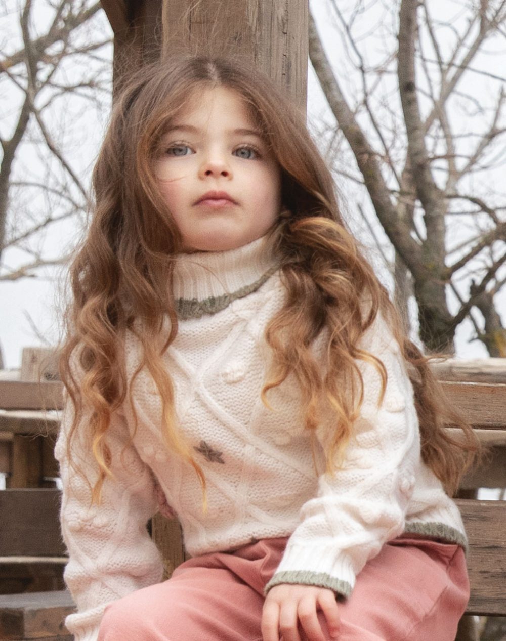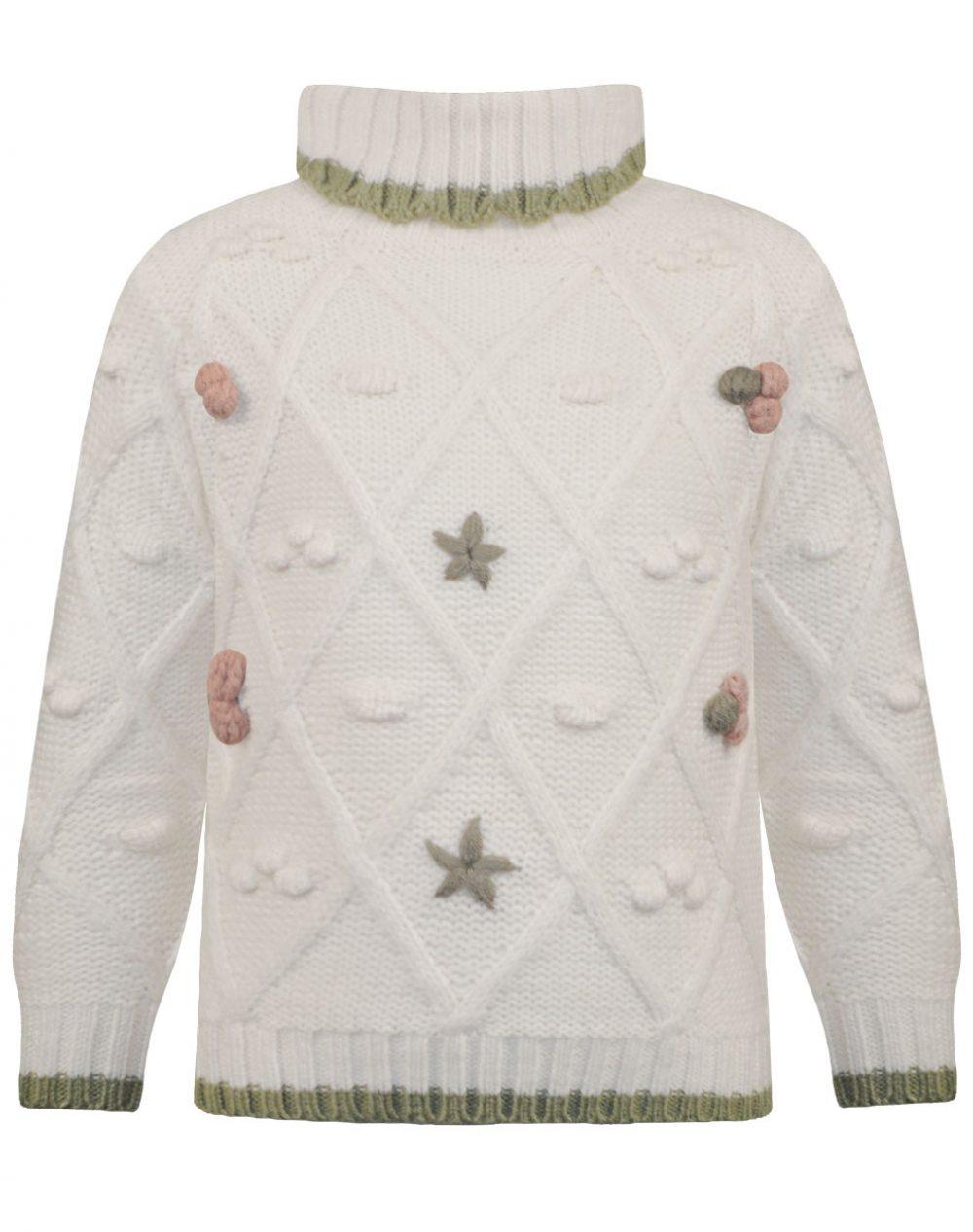 Βρεφική Μπλούζα Πλεκτό Ζιβάγκο Πουλόβερ με Όμορφα Διακοσμητικά Λουλούδια Μοτίφ και Πον Πον Σε Γλυκιά Εκρού Απόχρωση