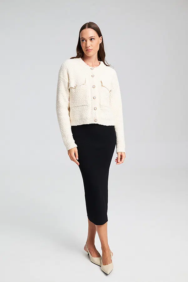 Η MOLLY CARDIGAN αποπνέει διακριτική πολυτέλεια και αποτελεί το ιδανικό κομμάτι για να ολοκληρώσει κάθε elegant εμφάνιση.